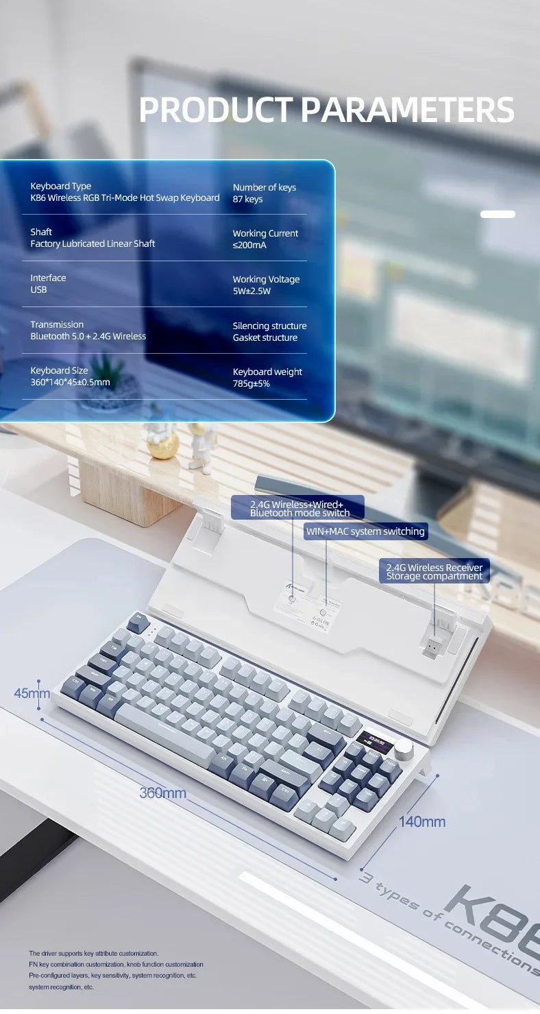 لوحة مفاتيح ميكانيكية Attack Shark K86 بمقبض معدني، شاشة TFT، تبديل سريع، إضاءة RGB، بلوتوث/لاسلكي، لوحة مفاتيح ألعاب بوظائف الماكرو